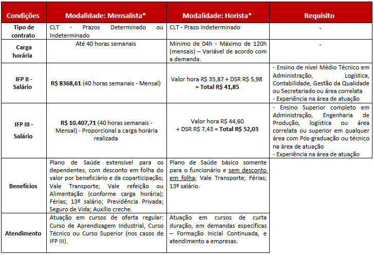 A modalidade de contratação e Carga horária será definida no momento da admissão, de acordo com a necessidade do SENAI.